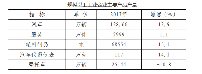 按行业分,规模以上企业中,工业总产值排前六位的依次是:(一)汽车制造业产值1675.40亿元,增长10.8%,其中汽车整车产值1322.73亿元,同比增长11.2%,汽车零部件产值350.18亿元,同比增长9.3%;(二)通信设备、计算机及其他电子设备制造业,完成工业总产值96.14亿元,同比增长21.5%;(三)皮革、毛皮、羽毛(绒)及其制品业产值59.98亿元,同比下降7.9%;(四)橡胶和塑料制品业产值58.33亿元,同比增长4.1%;(五)电气机械和器材制造业产值55.88亿元,同比增长15.3%;(六)纺织服装、服饰业产值48.51亿元,同比增长9.5%。六大行业全年共完成工业总产值1994.26亿元,占规上企业产值的85.0%,较上年下降0.8个百分点。