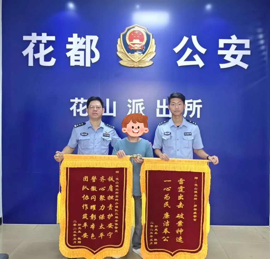 2025年5月15日,群众孙某将两面锦旗送到花山派出所,衷心感谢罗警官历时半年、跨省攻坚,为其追回被“杀猪盘”诈骗的13万余元血汗钱。同日,花山派出所巫警官快速侦破手机被盗刷案,为事主叶先生追回被盗手机及退赔款,获群众感谢并在“所长信箱”留言表扬。